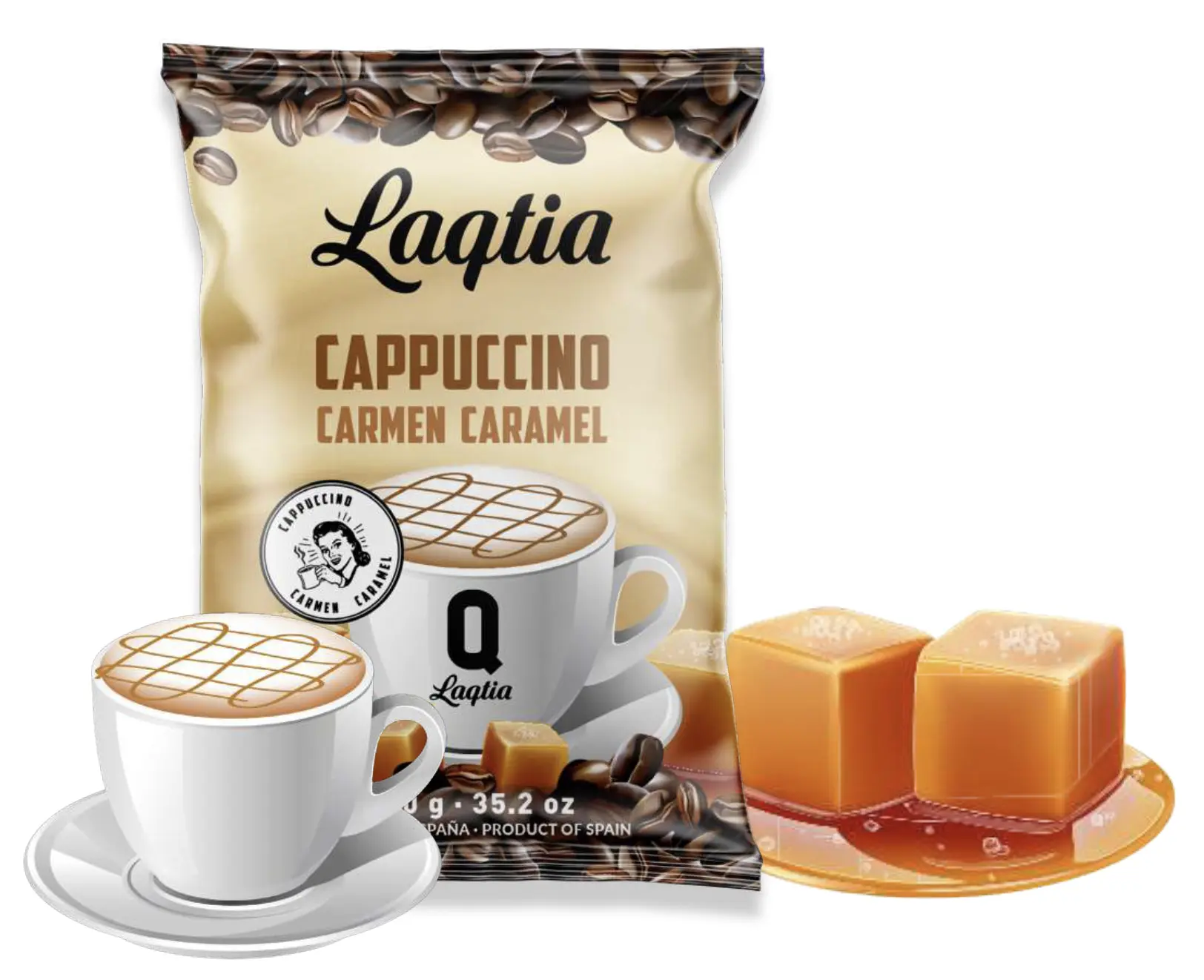 El cappuccino de Laqtia con el sabor único del caramelo elaborado por Carmen. Una bebida soluble, caliente y deliciosa, que destaca por su dulzura y cremosidad.