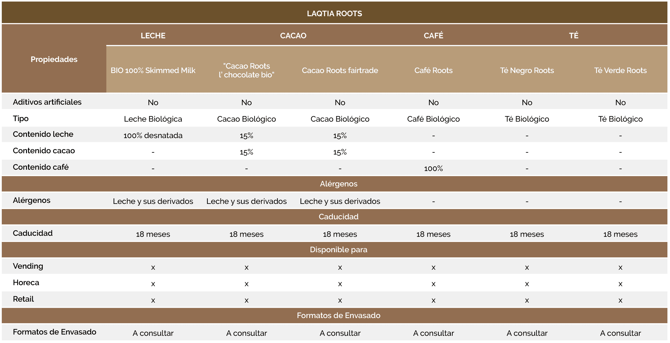 La gama Laqtia Q con frappés, smoothies y sus complementos como sus Choc Crem y Toppings; y la gama Laqtia Roots que incluye Leche, Café, Té y Cacao biológicos.